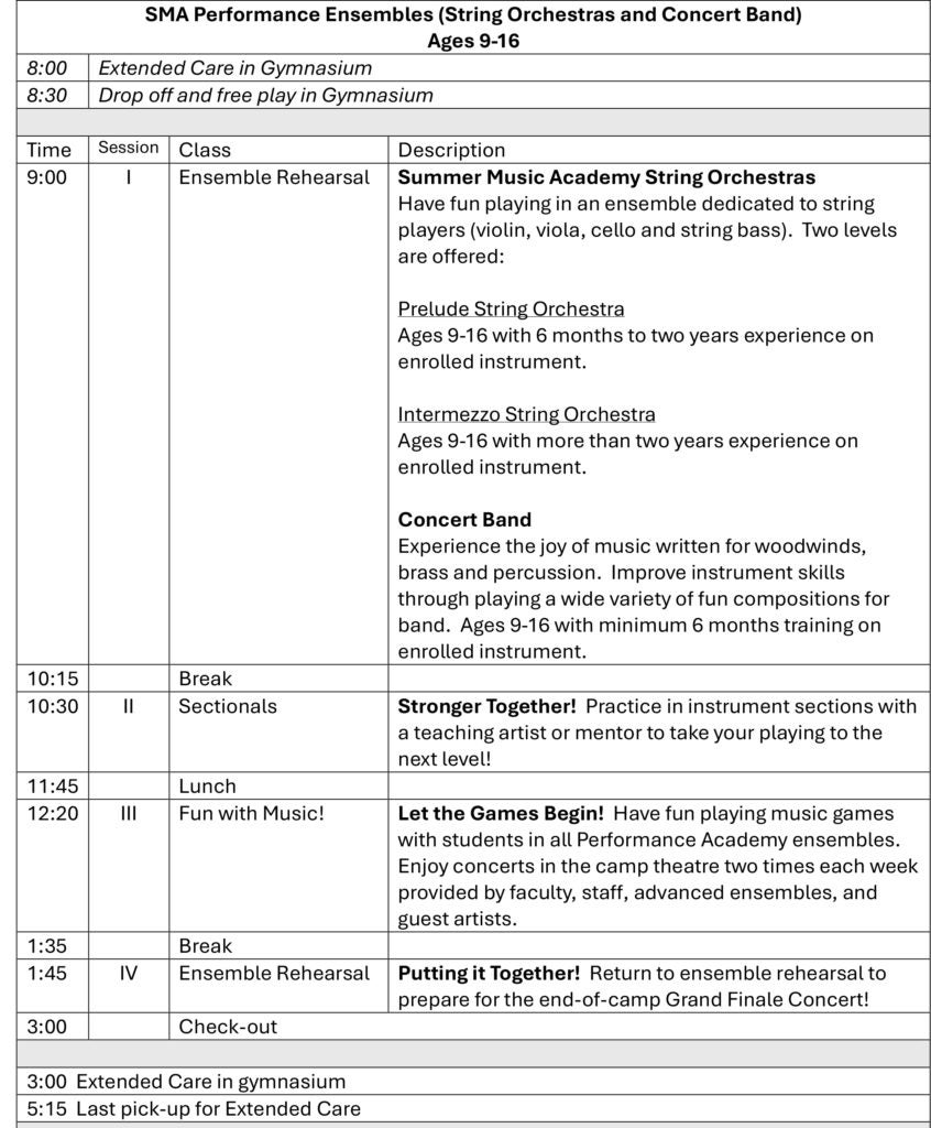 This year we are offering an Extended Care program for full-day students one hour before classes begin (8:00 am – 9:00 am) and 2 ½ hours after classes end (3:00 pm – 5:15 pm). Students may not be dropped off early because of lack of supervision and late pick-ups will result in a fee of $1.00 per minute starting at 5:20 p.m. due to increased staffing costs. Parents will be billed at the end of the week for extra charges, which are due and payable upon receipt. More than three late pickups may result in withdrawal of student in the Extended Care program. Extended Care is not available to ½ day students in the Kinder Violin program or one-week Chamber/Jazz Intensives.